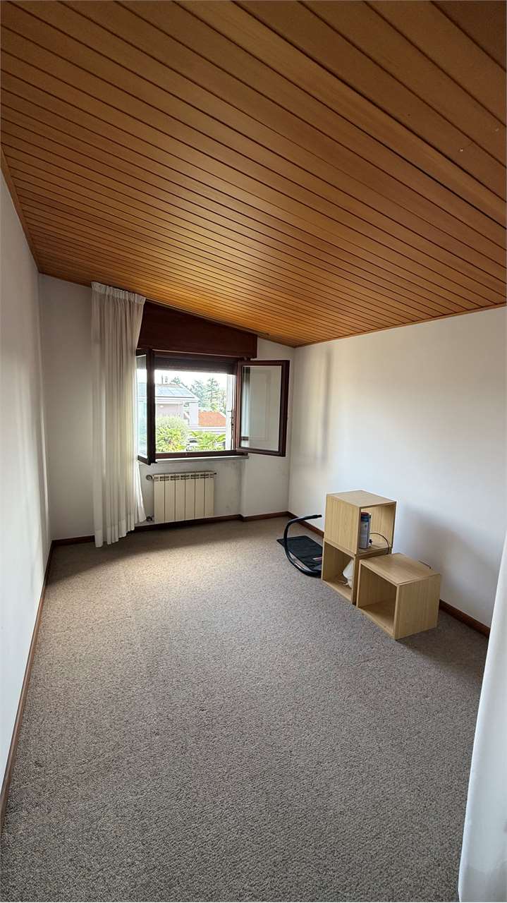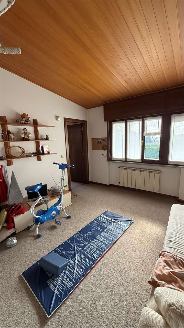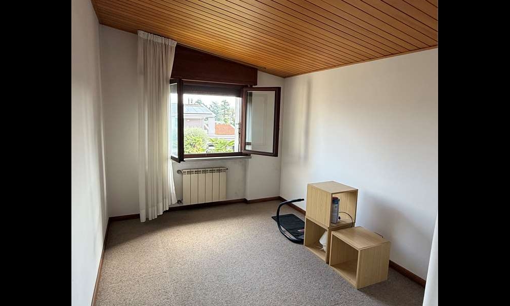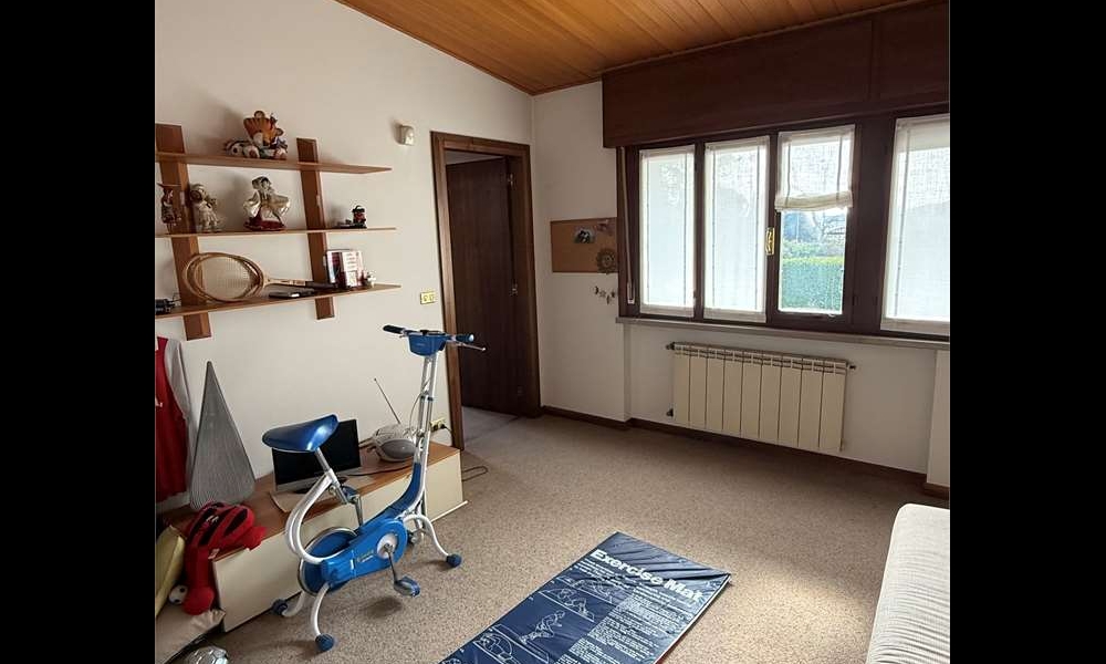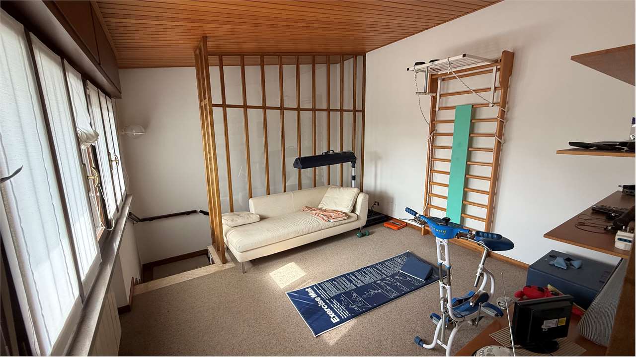 Il piano primo, leggermente sfalsato, ospita un ambiente versatile attualmente adibito a palestra, facilmente trasformabile in ulteriore camera o studio, oltre a un bagno e ulteriori spazi accessori.